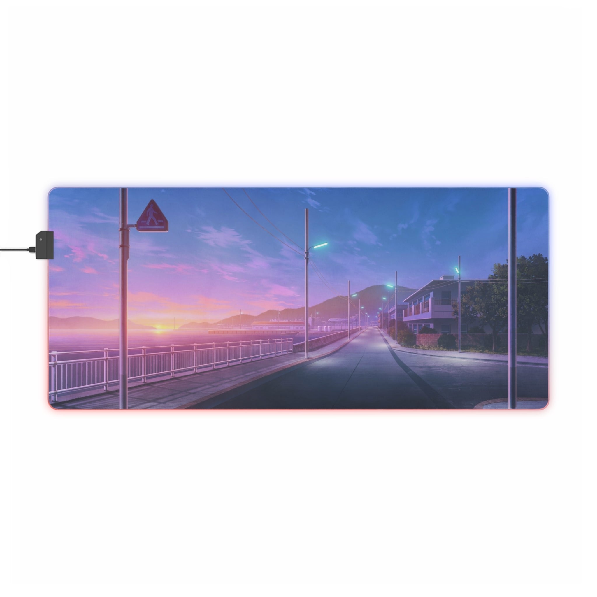 An anime style road with a stunning purple sunset on the horizon. RGB LED Mouse Pad (Desk Mat)