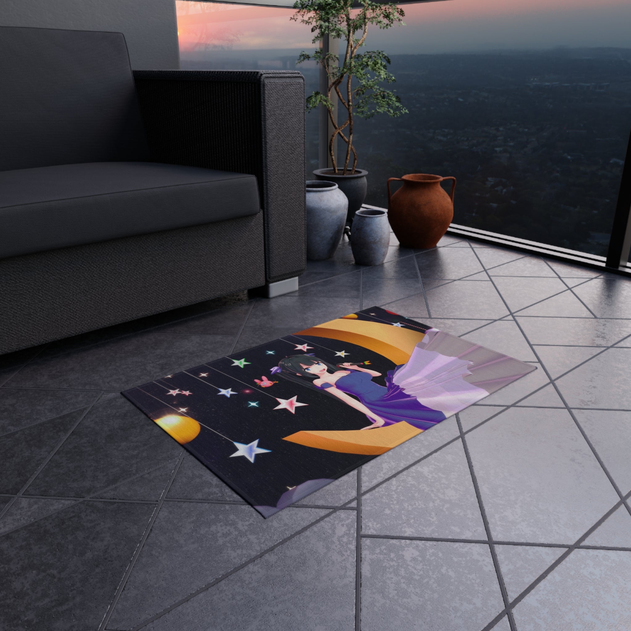 This area rug is crafted with durable construction and hemmed edges, offering lasting quality and style. A coated backing keeps the piece in place, making it the perfect finishing touch for any interior design. Vibrant colors and anime allow you to effortlessly match your existing aesthetic.